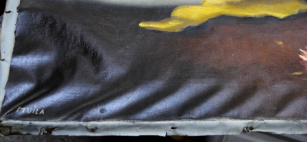 En el caso de la tela con pintura al óleo de la foto superior también sería necesario construir y acoplar unas bandas perimetrales a todo el largo y lo ancho de la misma. De esta manera seremos capaces de , una vez recuperada la tela, volver a tensar la misma sobre su antiguo bastidor o uno nuevo si éste no se ha mantenido en buenas condiciones.Estas “ondas”, si son pronunciadas, pueden producir grietas o craquelados en la pintura. Para evitarlo, es conveniente hacer “revisiones” periódicas para mantener en buen estado de conservación tela y pintura.